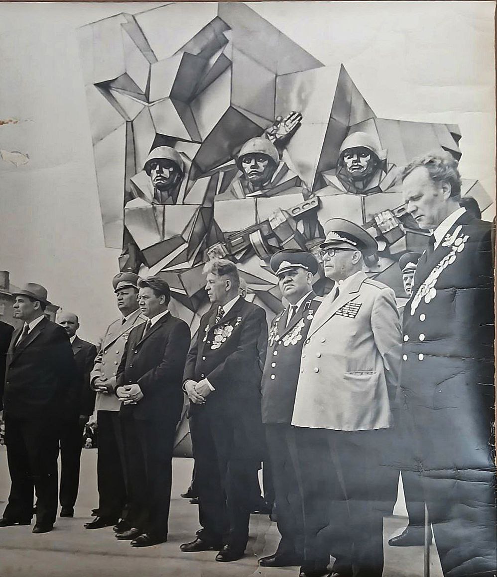 1. Фотография групповая. Открытие памятника Подольским курсантам в честь 30-летия Победы. На снимке изображены ветераны, стоящие у памятника в военной форме с медалями. Среди них 1-ый секретарь Горкома КПСС - В.С. Пестов. Фотография В. Лычагина.